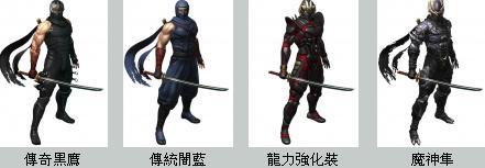 而除了绫音的造型之外,本次官方也特地公布主角龙隼四种造型服装要给玩家们欣赏,其中包括有由古代代代相传至今,集结隼一族智慧与最新素材所诞生的战斗用忍者装束隐藏服装传奇黑鹰;除了潜伏工作之外,也会用在礼仪等用途上的隼一族传统忍者装束兼龙剑传中主角服装造型的传统闇蓝;利用科学方法将龙血潜在力量给引出来,让着装者化身为战斗机器的战斗专用装龙力强化装;以及最後让主角龙隼的血之力暴走失控而魔神化的造型魔神隼等等,也是玩家们所一定要来使用看看的唷!