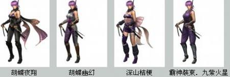 而在这次官方所公布的新服装造型方面,包括有女忍者绫音四种造型服装,如适用於夜间潜入工作,泛用性很高的隐藏服装胡蝶夜翔;以及适用於武器战斗,之前NGΣ2也曾经收录登场的胡蝶幽幻;与其说是忍装,不如说比较接近铠甲,但在各部位还是有花费工夫去设计而不失原本隐密性的NGΣ1服装深山桔梗;以及最後由DOA系列采用过来,霸神门正式忍装之一的霸神装束.九紫火星等等。