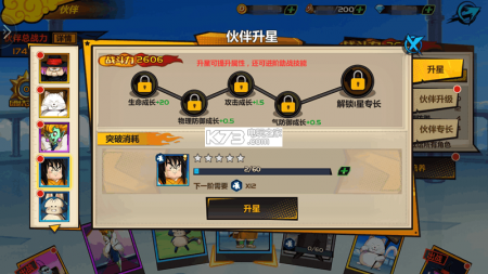 获得伙伴之后,还可以给伙伴升星哦,每提升1星,需要先进阶5次,最后一次才是升星成功哦,不过每次进阶,都可以获得不同的属性,提升战力呢!碎片可以通过军团商店兑换获得哦!