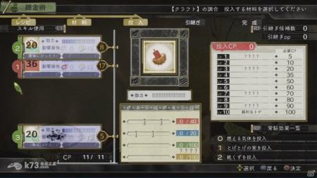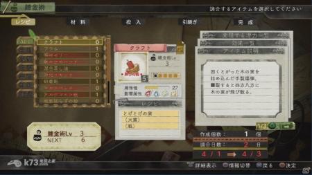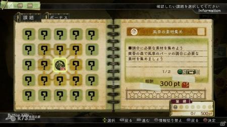 合成系统: 更深奥的合成 本作的合成相比前作将更加具有深度,继承和合成要素将会全新登场,即使是初次接触的玩家也能享受。 选择素材和材料等进行道具的合成 进化的课题管理系统 本作继承了《阿亚莎的工作室》里的课题管理系统并在其上进行了加强。