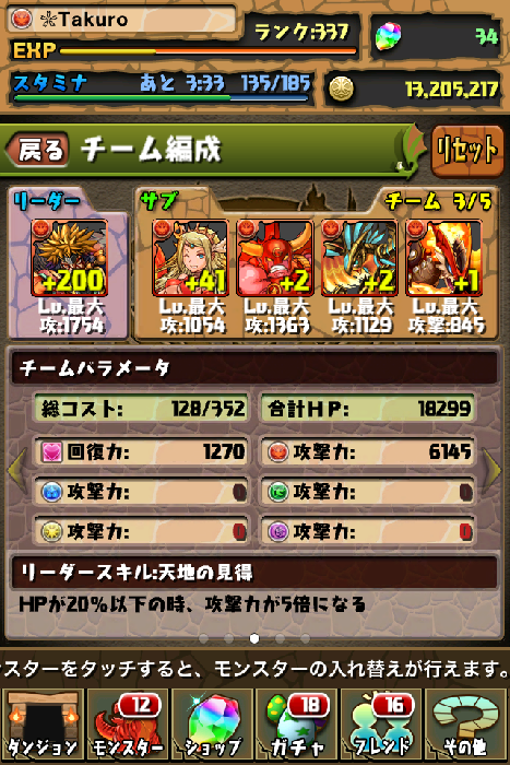 经过上次的石川刷宙斯的经验,结束后好好检讨,最后决定放上火玩具,只要可以提供稳定的心珠,那储技上面就会越是顺利,只要过了第一关,之后不要天降心珠,几乎都是稳定0石,当然碰到一些额外的状况还是可能会1-2石,不过有时候就算天降心珠,也可以转珠一次把血补到安全量,算是还不错的选择。不过这样子的队伍当然也有缺点,转珠宠只剩下泰坦,所以可能会面临断火珠的窘境。再来就是攻击力上面其实差蛮多的,不过我觉得无伤大雅,反正最后一关都是秒杀,大抵上除了攻击力,其他方面火剑跟火玩具都是差不多的。