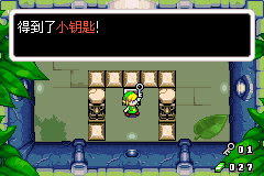 房子里面比较暗,所以需要把四个机关踩下去,点亮房间,然后中间会出现一个宝箱,打开后得到小钥匙,接着向上走,按A键开门,进入