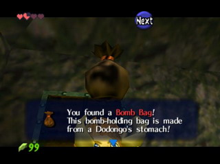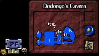 区域8进入后跳到对面,在右侧有个很明显的大宝箱,能得到本迷宫的重要道具――BOMB BAG(炸弹袋),现在能装20个炸弹。终于可以随心所欲地埋地雷了。稍微试试身手吧,下面就有个通向区域12的门,炸开后弹完怪就能买到弹弓种子和坚果。
