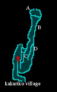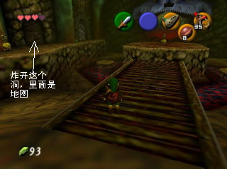 进去之后首先在区域1,先举起旁边的炸弹花扔到被封住的洞口,进入主迷宫。然后沿着木桥直走,跳过浮动平台,向左转,炸开下图所示的洞后,里面的宝箱就是MAP(地图)。那几个能射激光的怪用炸弹炸。然后跳到该区域的左下角,用炸弹花炸开右下角的石头门,进入区域2.