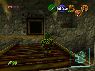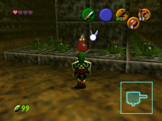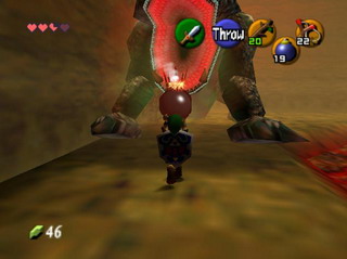 区域4里有一种像鳄鱼的怪,只能用炸弹花搞定,注意要炸到它的嘴最有效,不是很好打,不行的话就无视好了。它吐的火能把你的小木盾给烧掉,最好使用海拉尔盾。用仅有的一个火台(离炸弹花很近)点燃DEKU STICK(德库木棍),然后把该区域内其他3个火台点燃,门就会开了,要快一些,迟点的话刚点燃的火台就会熄灭了。棍子不够的话把区域5的洞炸开,里面有个吐坚果的小怪,打败他后可以买到棍子。