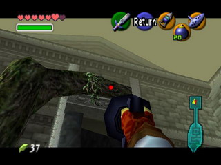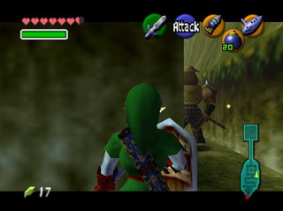 接下来就可以前往森之神殿了,它位于Sacred Forest Meadow的最深处。对这个地方还有印象么?就是穿过KOKIRI FOREST(科克里之森)和LOST WOOD(迷失之森),少年时期和SARIA MM学得乐曲之处。在LOST WOOD途中有个小子档道,原来是少年时期就开始为难我的那小子。向他吹奏SARIA’s song ,证明是SARIA的好朋友,他就会让开了。一直来到Sacred Forest Meadow。在曲折的小径上不再是吐种子的小怪,而变成了牛头怪看守了。要硬冲的话显然不行,最好的方法是在拐角处用按住Z键,让视角变为固定在身后,然后站在拐角,就能像MGS一样能够查看到怪物大致的走向,如果是背对着你的话,不要犹豫,冲出去,待他还没回头的时候,用绳勾攻击之。如果是正对着你加上有一段距离的话,可以冲出拐角,然后迅速返回,把他引过来,然后趁他冲过头的时候,用绳勾攻击他背部即可。