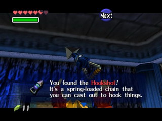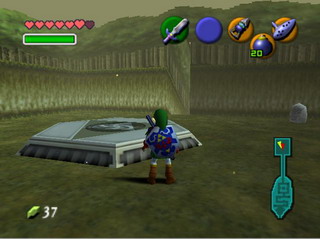 穿过已经成为一片废墟的Market和Hyrule Field,来到了Kakariko Village,这儿变化倒不大,但是由于离现在的Ganondorf的大本营――海拉尔城堡过近,以至于天空上布满了乌云。一直走到村子最右边的Graveyard(墓地),能发现在最左边有一个新的坟墓(墓前同样有束花),拉开后,跳进深洞中,看到了少年时期的守墓人的幽灵,与他回话后跟着他走一直走到底,不要跟丢了,到底后得到Hook Shot(绳勾)
