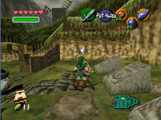 从现在开始,你就可以控制帅气的chengren版的LINK了(连声音都变的那么帅 XD),相比少年时期,有些武器是无法使用的(道具栏中用灰色表示),但令人匪夷所思的是,衣服居然能通用?地图版图倒是没什么太多的变化,但是村落中的事件是完全变化了。心之碎片,蜘蛛等等的取得地点,是少年和成年时代共通的,所以不存在成年拿过的东西,到少年期相同的地方还能再拿一次的情况。如果想要回到少年时期,只要把大师之剑放回时之圣殿即可。现在的世界一共有五大神殿等待着你去探险,这五个地方并没有一个严格的先后顺序,只要能找到入口所需要的道具或者解开相应的迷题即可进入。接下来,先从刚刚剧情提到的Kakariko Village(卡卡利科村)开始冒险吧。