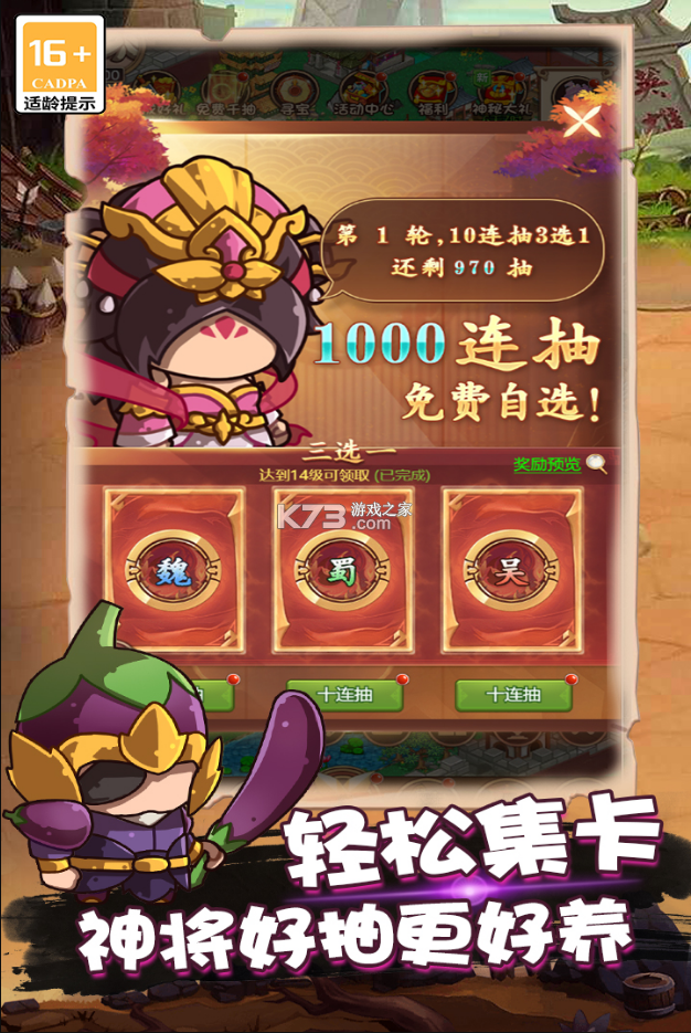 6、解锁更多的游戏内容和功能,并且可以获得神级赵云作为奖励同时,游戏还提供了免费的千次抽卡,让你有机会获取更多的武将