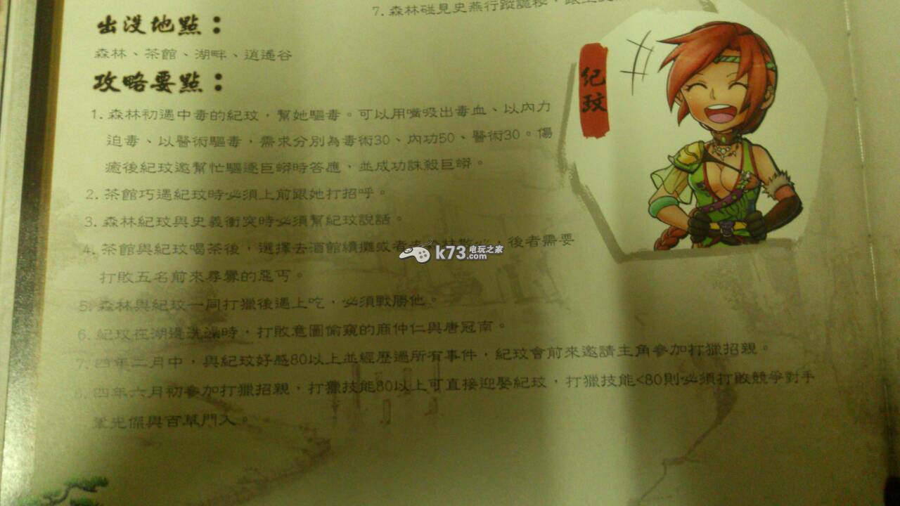 1森林初遇中毒的纪玟,帮他驱毒。可以用嘴吸出毒血、以内力迫毒、以医术驱毒,需要分别为毒术30、内功50、医术30.伤愈后纪玟邀请帮忙驱逐巨蟒是答应,并成功诛杀巨蟒