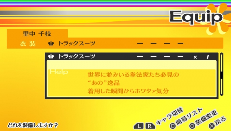 | 制服・冬+鼻メガネ | 雪子加入後、电视中和クマ对話得到 | - | クマ以外 |