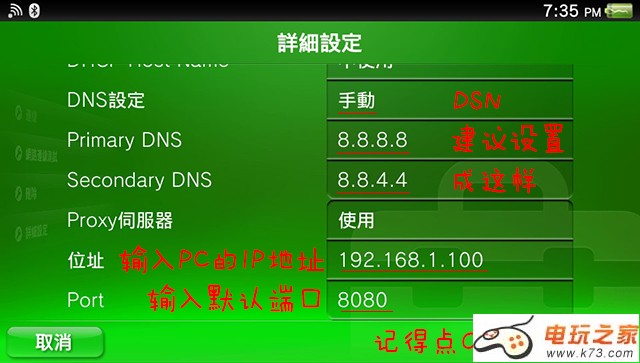 【设置】-【网络】-【Wi-Fi设定】-【点击当前与PC共用的网络连接】-【详细设定】-【Proxy伺服器】-【使用】,设置如下图: